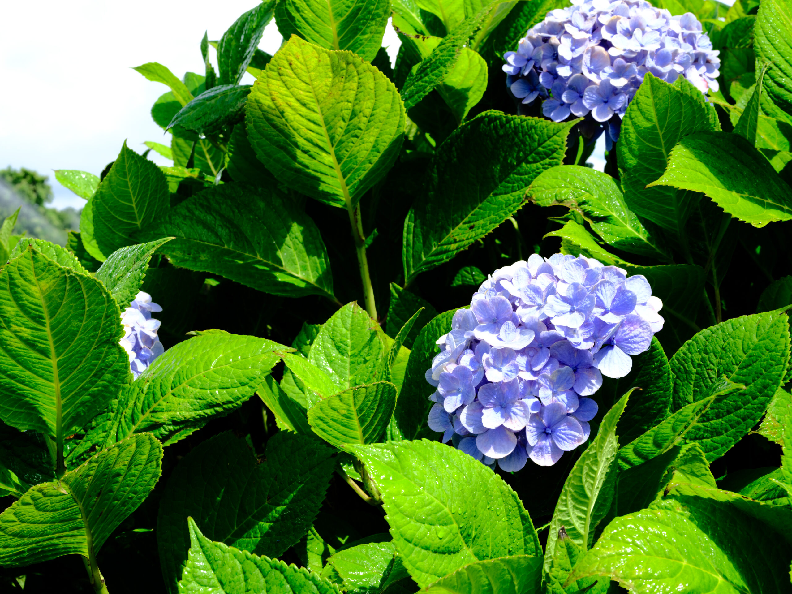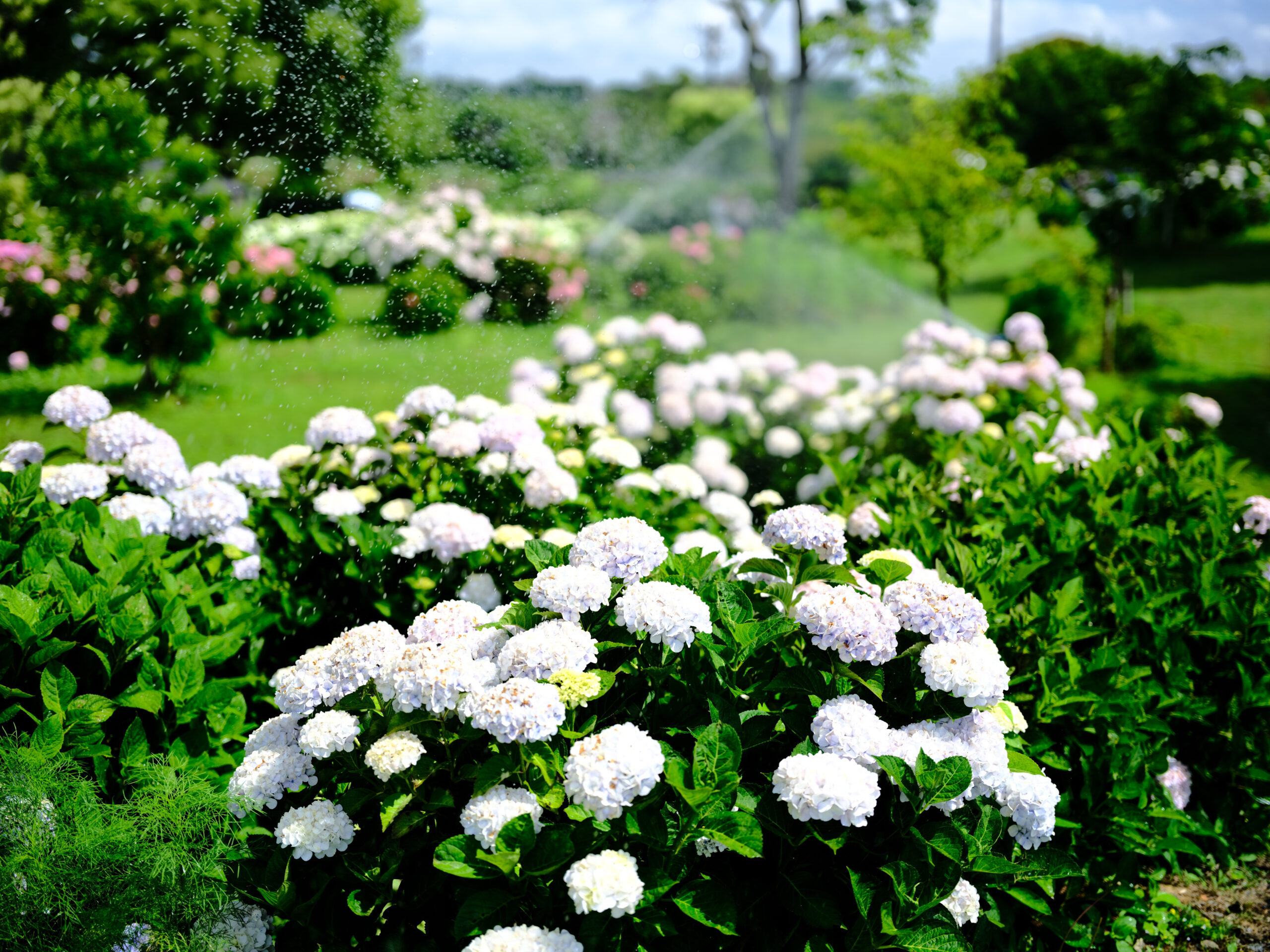 青い空、勢いよく噴き出す水、水にぬれて輝く紫陽花……