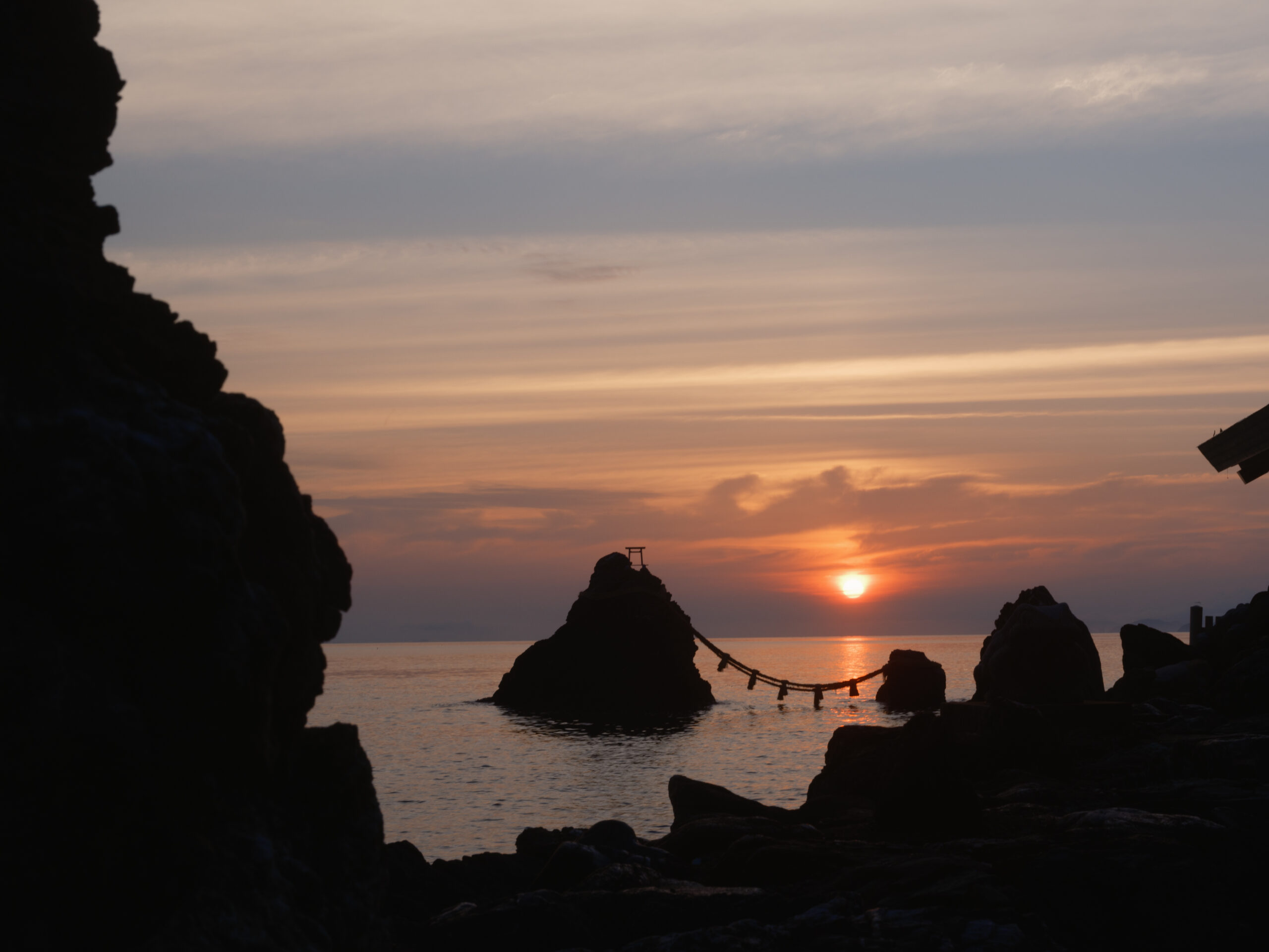 猿田彦大神ゆかりの霊石である「興玉神石」と、岩の間から昇る「日の大神」を拝する鳥居の役割を果しており、日の出の遥拝所でもあります。