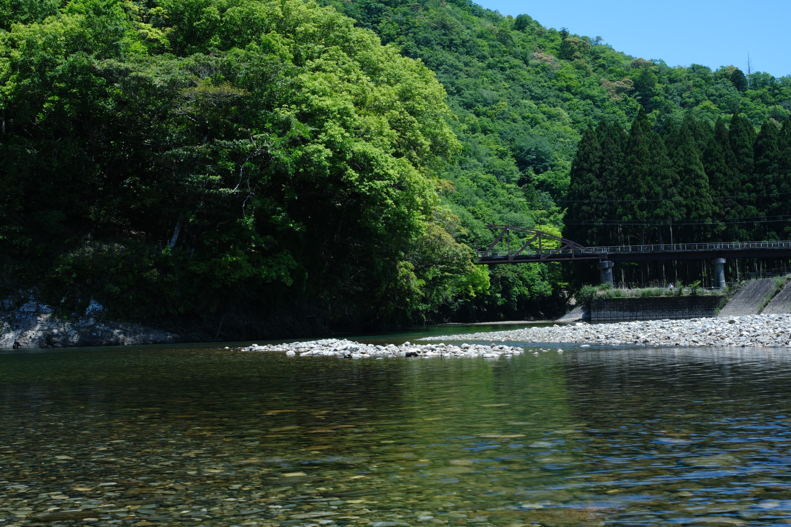 浅瀬の川と山へと延びる鉄骨の橋。ここが瀞峡なのでしょうか?